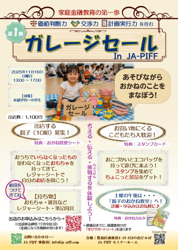 2025年11月16日(日)、当協会セミナールームにて、小学生以下の子どもたちによる「ガレージセール」を開催いたします。